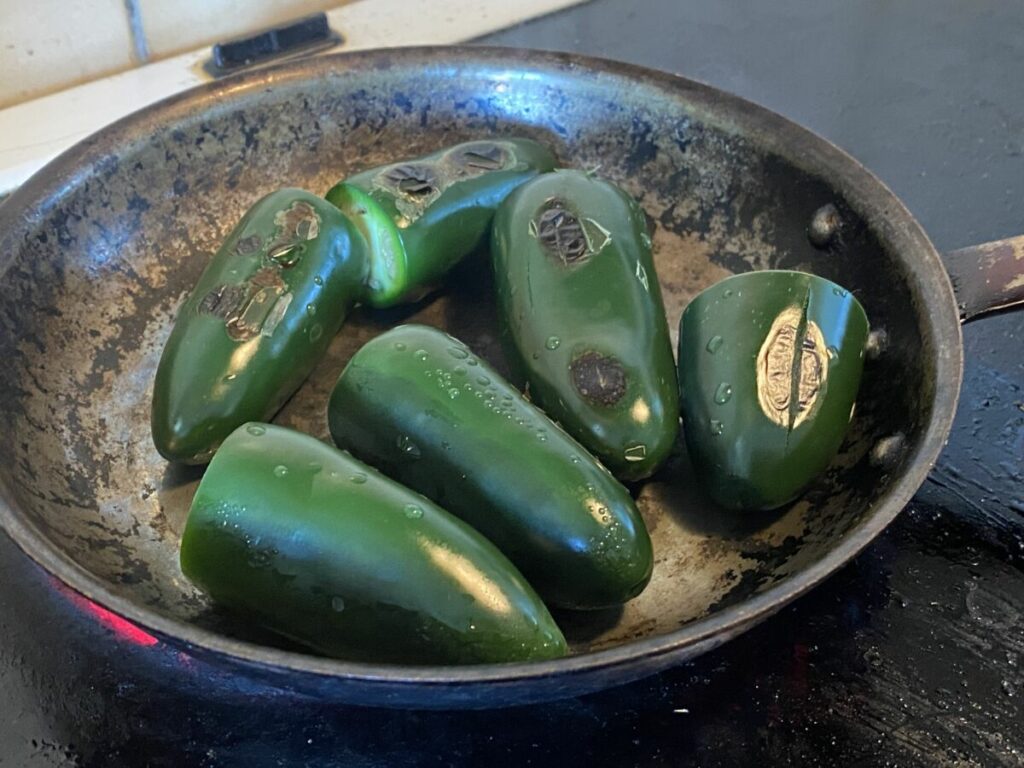 Jalapeno som rostas i tokhet panna. Grill blir ännu bättre